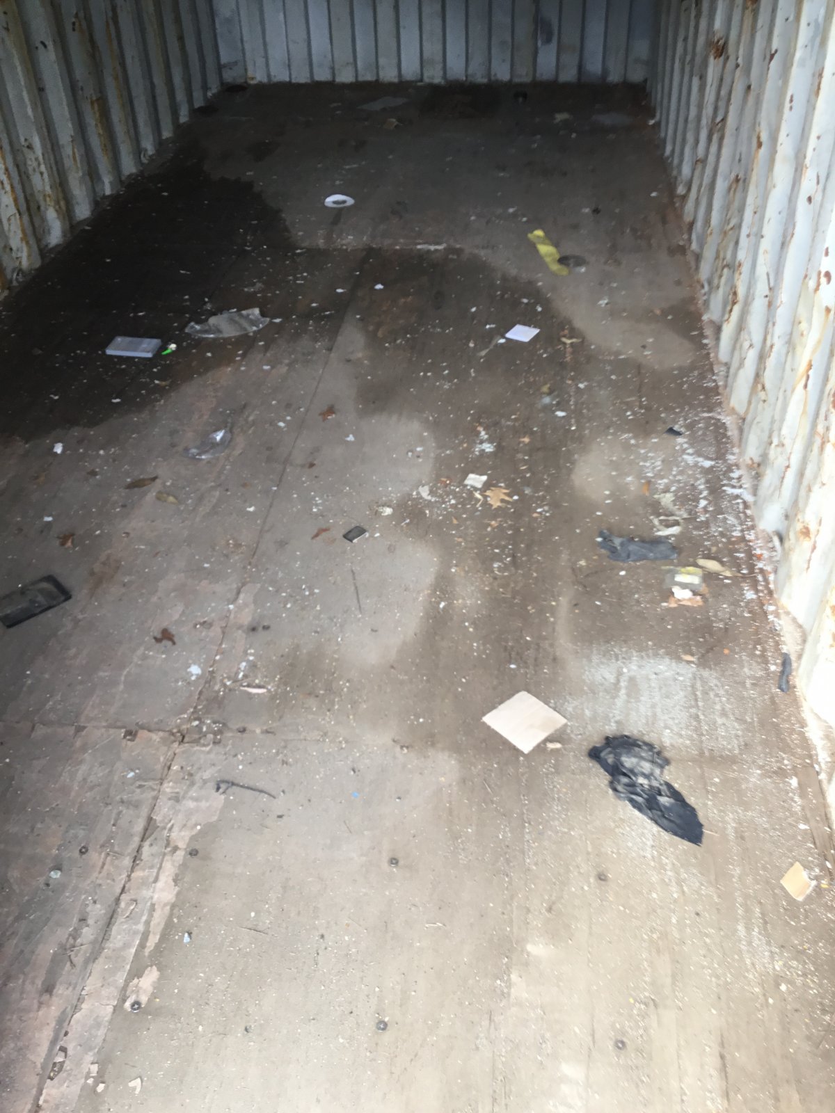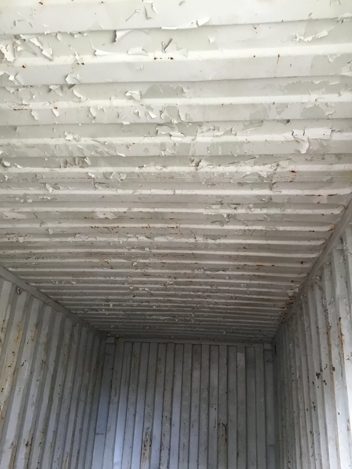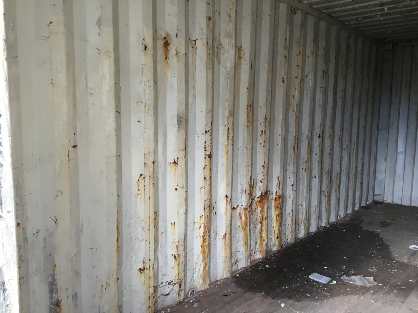 Impact damaged. External rust on walls. Internal rust on walls. Paint flaking inside.