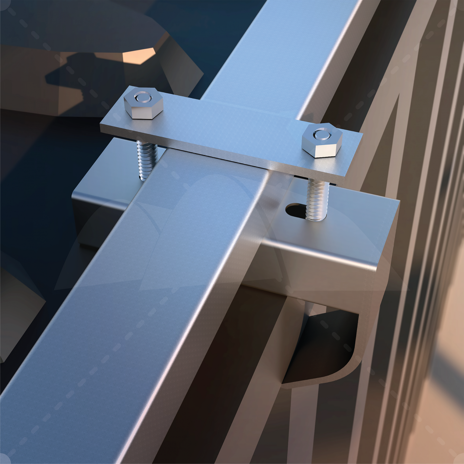 Additional square tube base rails connect the roof truss connection spigots to the top edge of the container using a system of high-strength bolts and specially manufactured brackets and C clamps. The simple C clamp and a bolted anchoring system makes building this shelter super-easy, because no special tools are required.