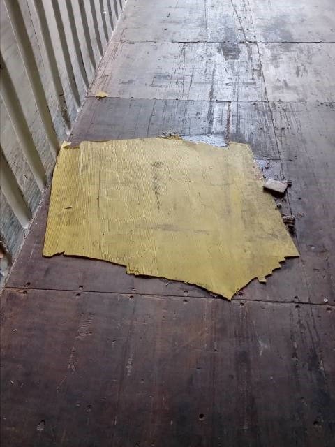Damaged door seal, broken floor panels and several floor sections requiring securing. Glued piece of coreflute on floor and overall container shows signs of general wear & tear to panels and paint