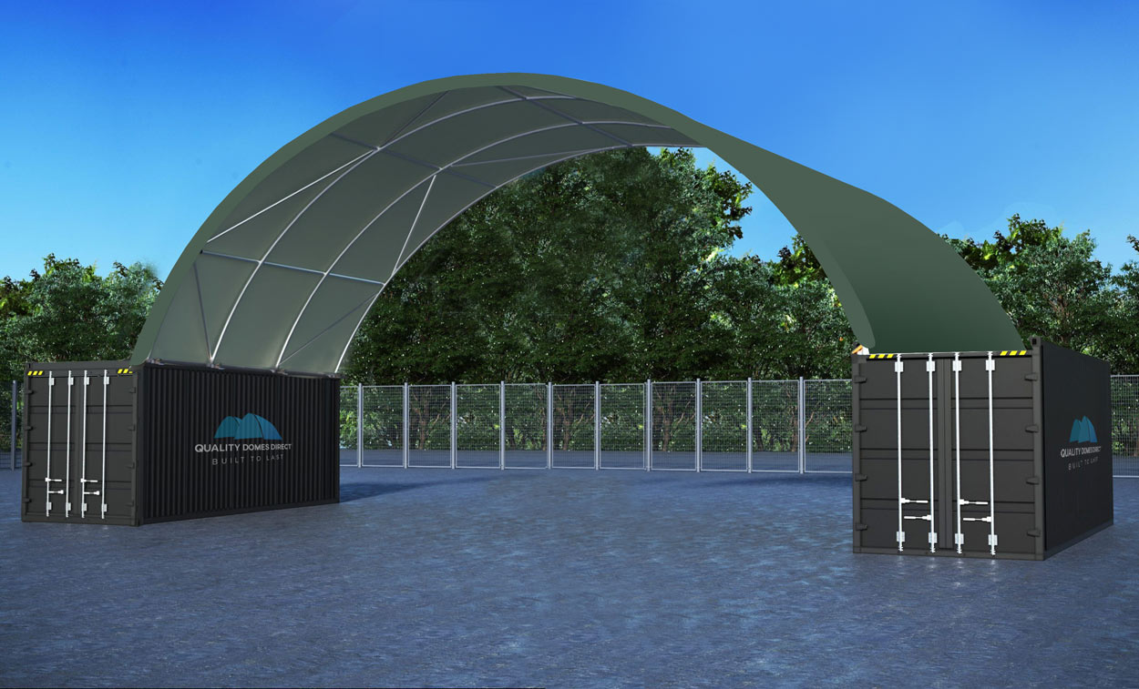 The Army Green 40x20ft (12x6m) Quicklock Commercial Grade Dome Shelter is a semi-permanent structure designed to attach seamlessly to two 20ft shipping containers without welding any components together. The undercover ground area covers 72m² of dry and secure space. Its solid galvanised steel tube truss frame is engineered to withstand harsh environmental conditions, offering superior protection all year round