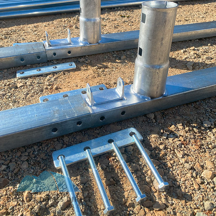 Proceed to lift each assembled arch one at a time. This step will require lifting equipment depending on the size and weight of the arches. Positioning each arch onto the previously installed base plates on top of the shipping containers, and secure them down.