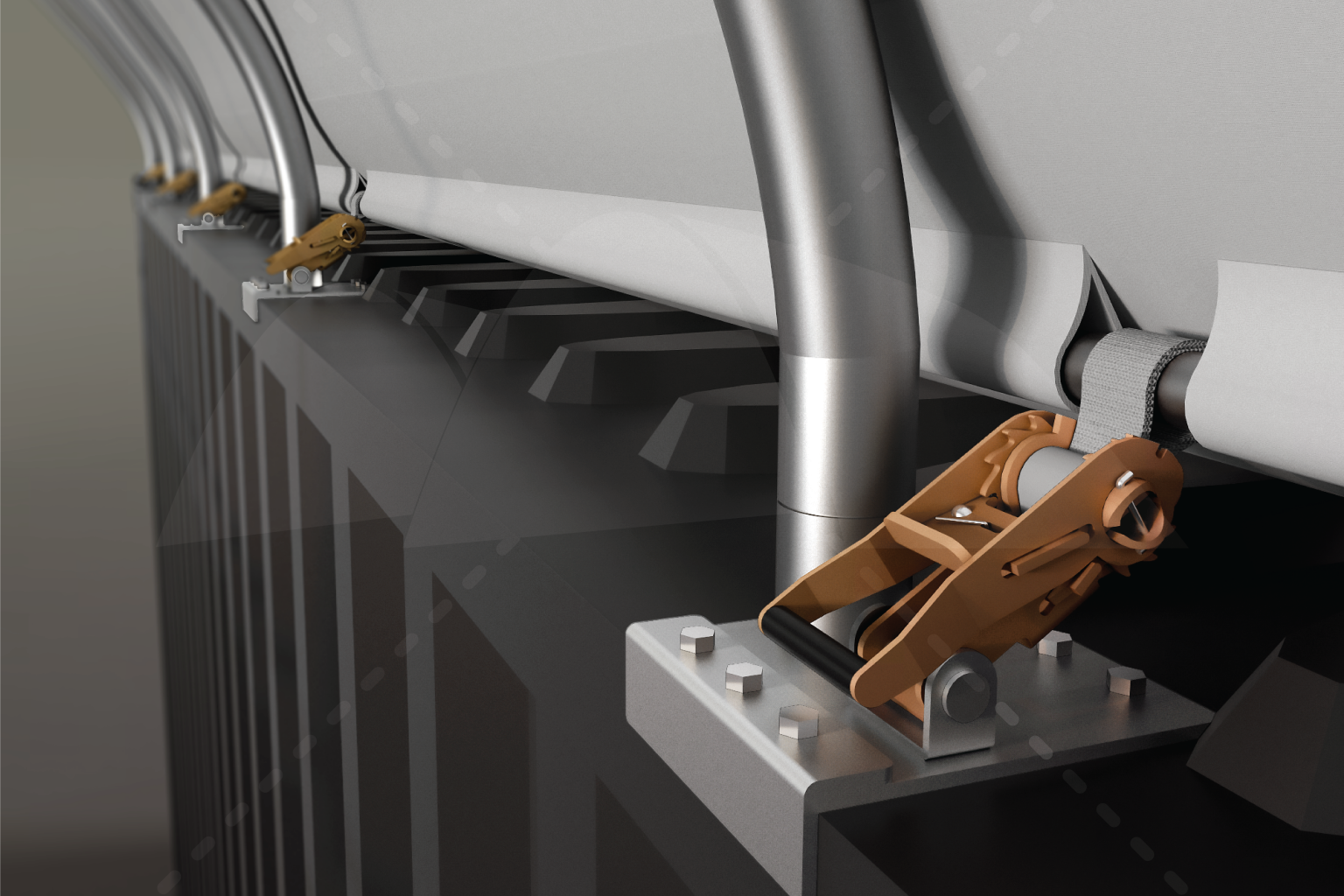 - Welded base plates for a strong, secure connection to the shipping containers.