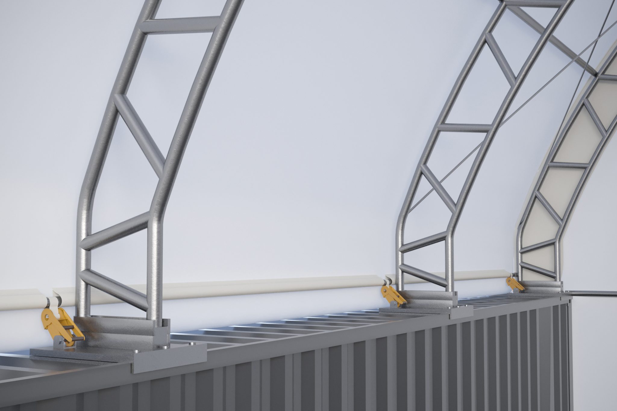 This Double Truss Container Dome Shelter features a tough, robust steel frame with roof support posts, additional roof purlins, bracing purlins and wire bracing and a welded base plate design. Crafted from high-quality, hot-dip galvanized steel, the structural frame offers exceptional strength and corrosion resistance, ensuring long-lasting durability. Engineered to meet stringent Australian standards, this frame provides structural integrity that can endure heavy winds and challenging environments. With its sturdy construction, you can trust that our container dome shelter frames are built to last, offering both peace of mind and unbeatable protection for your valuable assets