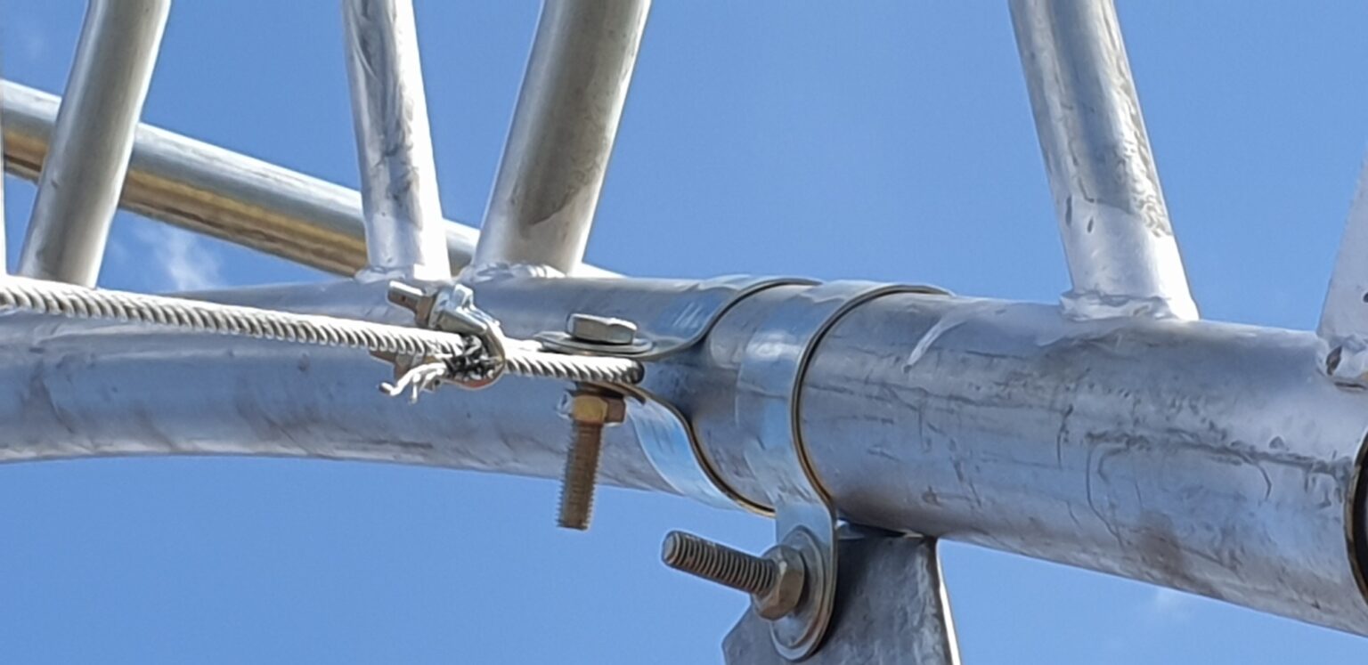 This shelter is built tough, featuring double truss arches, with each truss segment securely bolted to one another using a robust centre plate connector. To connect the truss to the container, specially manufactured base plates are welded to the outside edge of the containers. Roof truss connection spigots securely connect the roof truss to the base plate. For additional strength, truss support posts are also welded into position and connected to the truss above. The entire roof structure is connected  using a series of heavy-duty purlins, side and top bracing purlings, and tension wire for additional strength.