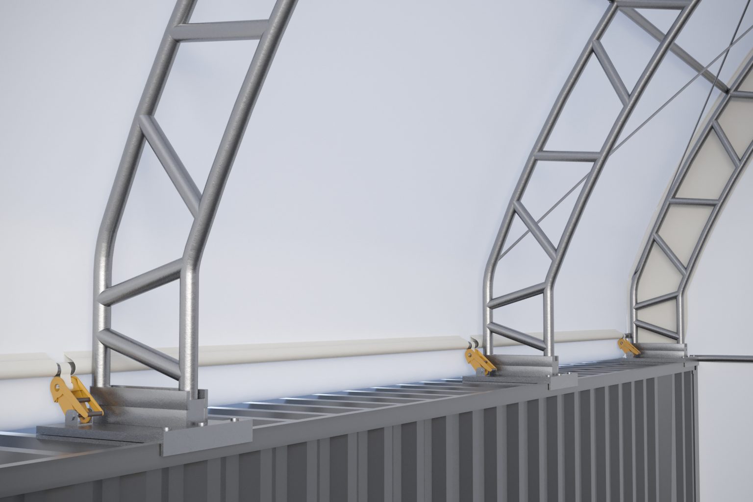 This 40ft outside edge container-mounted shelter is suitable for General Purpose (GP) and High Cube (HC or HQ) containers, offering a durable and secure solution for large-scale projects across multiple industries. Building this shelter on top of a double post truss and eaves rail system is also possible.