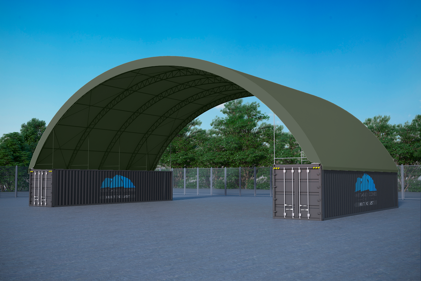 Utilising 40ft shipping containers as a sturdy base, this large domed shelter provides secure storage for construction supplies to heavy machinery, equipment, and even livestock.