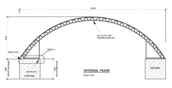 With 21.35m wide front and rear exits, this dome shelter is well-suited to projects requiring light vehicle and heavy machinery access, as well as housing mass shelving and racking systems. This shelter is built tough, featuring double truss arches bolted together using a centre plate and welded base plates positioned on the outside edge of the containers. Truss support posts are also welded into position, with extra roof purlins, bracing and tensioning wire for additional strength.