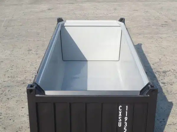 Our open top half height shipping containers also feature a Front Discharge Hatch and Rear Barn Doors. This allows for fast discharge of the loaded contents by opening the hatch or doors and tipping the container. Inside the container you will find tapered smooth inner walls that come down to a coved edge to smooth floor.